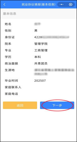 核对个人信息,无误后点击“下一步”(注意:个人信息将直接显示在协议书中,姓名、身份证号、专业、生源地、政治面貌如有错误,应与所在二级学院辅导员或学校招生就业与继续教育处联系修改后再申请)。