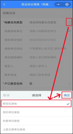 (1) ★档案去向类型:指毕业后档案去向的类型,在签约前尽量和单位沟通清楚档案及户口去向等信息,如果确实无法确认,可先选择转递回生源地(后期拿到调档函后再另外填报)。