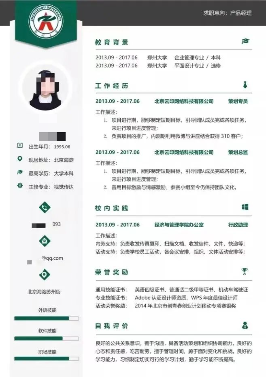 无论应聘什么岗位,一份好的简历都离不开以下几个模块: